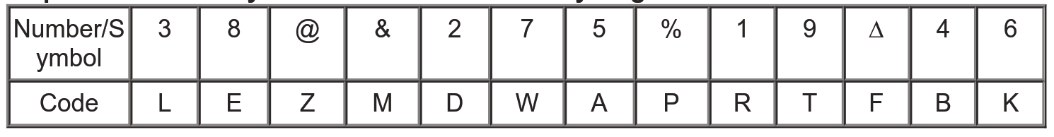 | Number/symbol | 9 | 7 | 6 | - | 8 | @ | # | + | 2 | % | + | 3 | 1 | & |