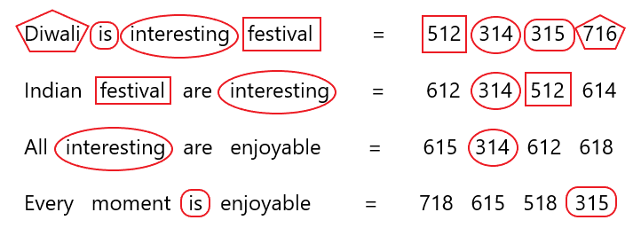 "Indian festival are interesting" coded as " 612 314 512 614 "