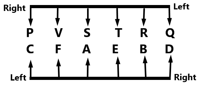 Twelve people are sitting in two parallel rows containing six people each, in such a way that there is an equal distance between adjacent persons. In row-1 P, Q, R, S, T and V are seated and all of them are facing South. In row-2 A, B, C, D, E and F are seated and all of them are facing North. Therefore, in the given seating arrangement, each member seated in a row faces another member of the other row.