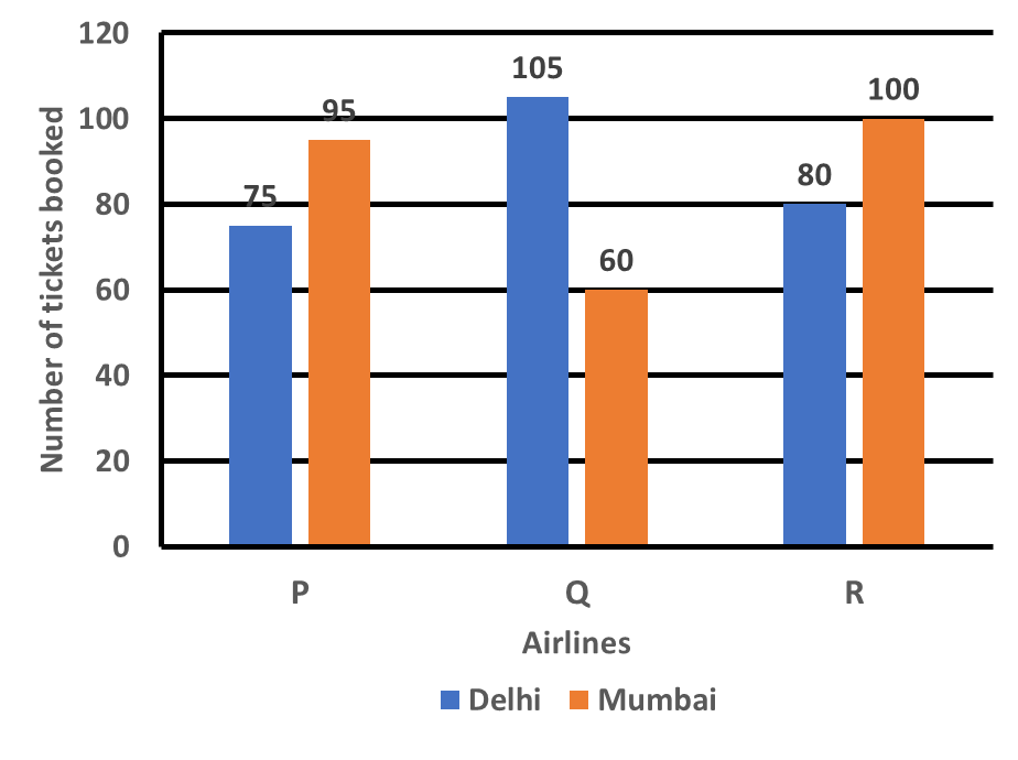 The bar-graph depicts the number of tickets booked for Delhi and Mumbai by Airlines P, Q and R