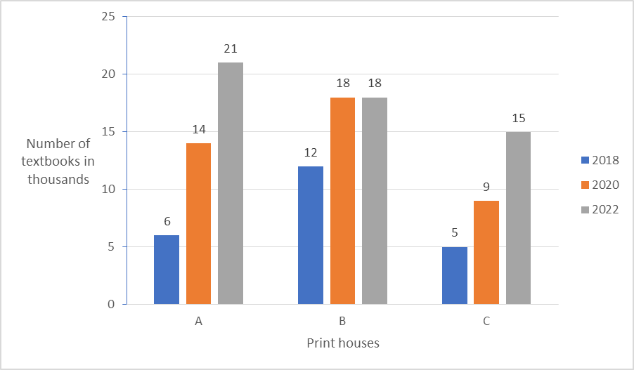 The following chart shows the production of textbooks in thousands in the years2018, 2020 and 2022 from the print houses A, B and C, respectively.