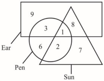 1 Sun is also a Pen and Ear: This means the number in the region where the triangle (Sun) overlaps with the circle (Pen) and rectangle (Ear) is 1.