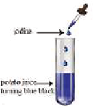 (c) Potato juice contains starch, which turns blue black with iodine.