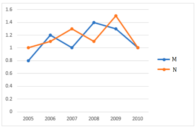 If ratio of imports to exports is more than 1 that means the imports are more than exports for that particular year.