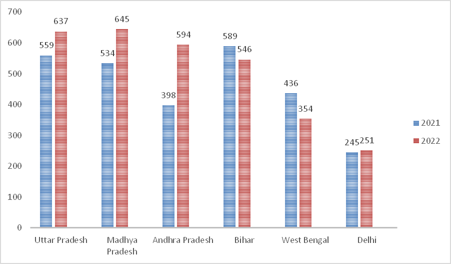 Total crop production for Delhi in 2021 and 2022 = 245 + 251 = 496