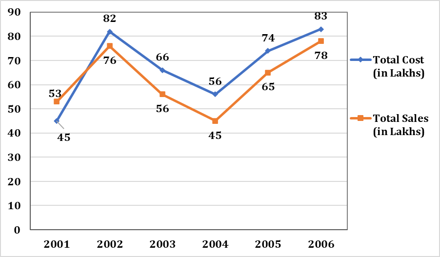 The graph presents total cost and total sales values (in lakhs) of a firm over six years.