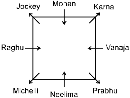Colleagues Karna, Michelli, Prabhu, Vanaja, Mohan, Raghu, Jockey and Neelima are sitting around a square table in such way that four of them sit at corners and four of them at the middle of the sides. The ones who sit at the comers face outside (opposite to the centre) and the ones who sit at the middle of the sides face towards centre. Vanaja is seated third to the right of Jockey. Vanaja faces towards the centre. Mohan is third to the left of Prabhu. Prabhu is not sitting at middle of any of the sides. Only one person sits between Mohan and Raghu. Raghu is not an immediate neighbour of Prabhu. Neelima faces towards the centre. Karna is not an immediate neighbour of Raghu. Who is an immediate neighbour of both Mohan and Raghu?
