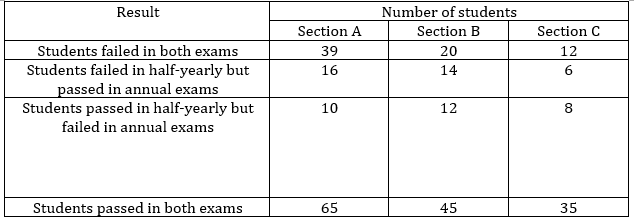 The table shows the results of half-yearly and annual examinations of three sections A, B, C of class X students in a school.
