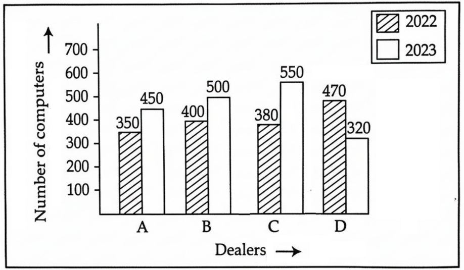 Number of computers sold by dealers A, B, C and D in the years 2022 and 2023.