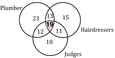 The numbers in different sections indicate the number of persons. How many plumbers are there who are also hairdressers and judges?