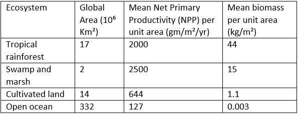 Open ocean covers the largest global area (332 × 10⁶ km²) despite having low NPP per unit area (127 g/m²/yr). This large area makes its total global contribution to primary production the highest.