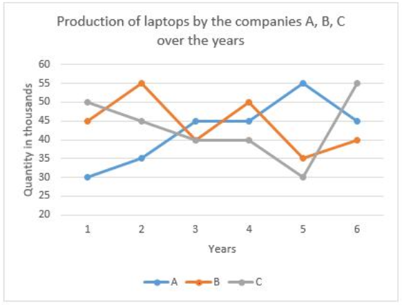 The production of laptops by three different companies namely A, B and C over the years