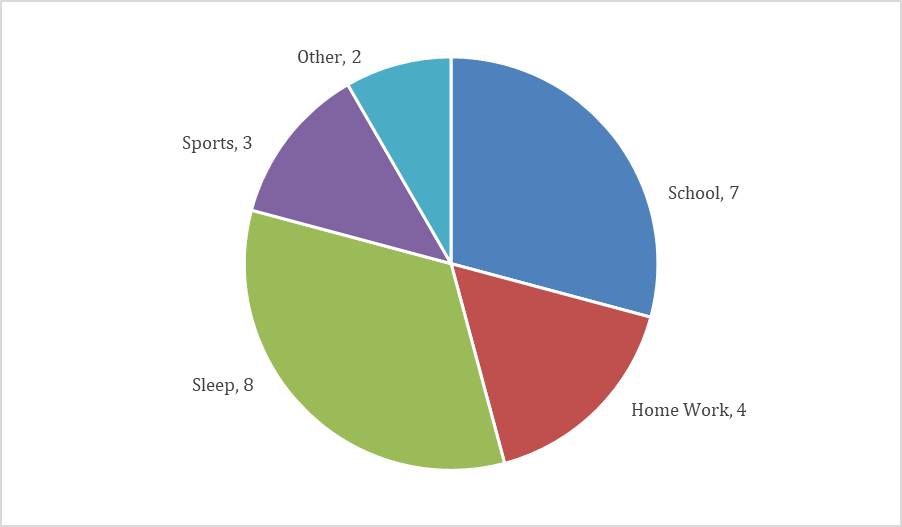The pie chart shows the numbers of hours used for different activities of the day. Total hours in a day are 24.