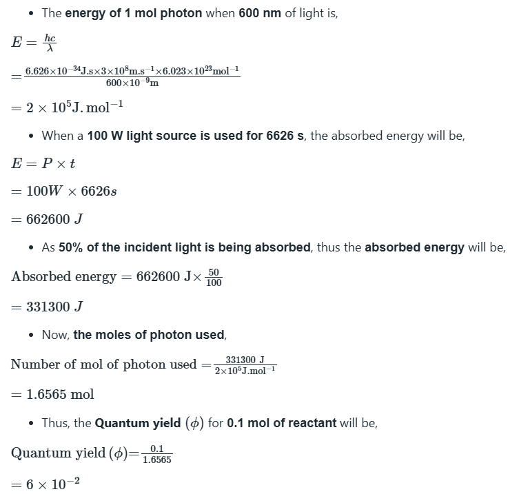 Substance ‘A’ is exposed to 600nm, 100 W light source for 6626s, with 50% of the incident light being absorbed. ‘A’ decomposes according to the reaction A→B . As a result of irradiation, 0.2 mol of B is produced. The quantum yield of the reaction is closest to