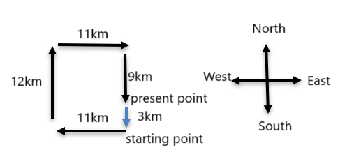 ​Surya participated in a marathon. From starting point he ran 11 km towards West, turned right and ran for 12 km and turned right again and ran 11 km