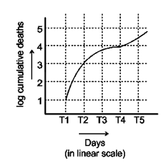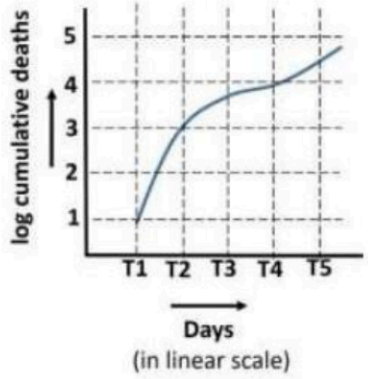 Curve is logarithmic, so equal vertical spacing means multiplicative increase in actual numbers