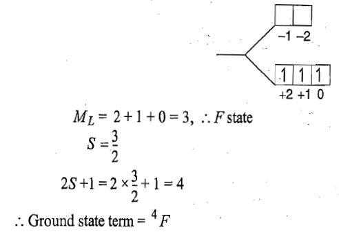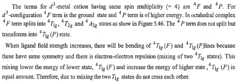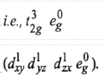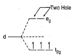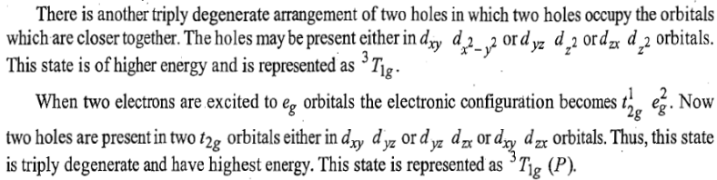 Now there are two holes, one in t2g and one in eg orbitals. There are two triply degenerate arrangements of holes corresponding to this electronic configuration. The lower energy state will arise when two holes occupy the orbitals as far apart as possible. Therefore, the two holes may be present either in