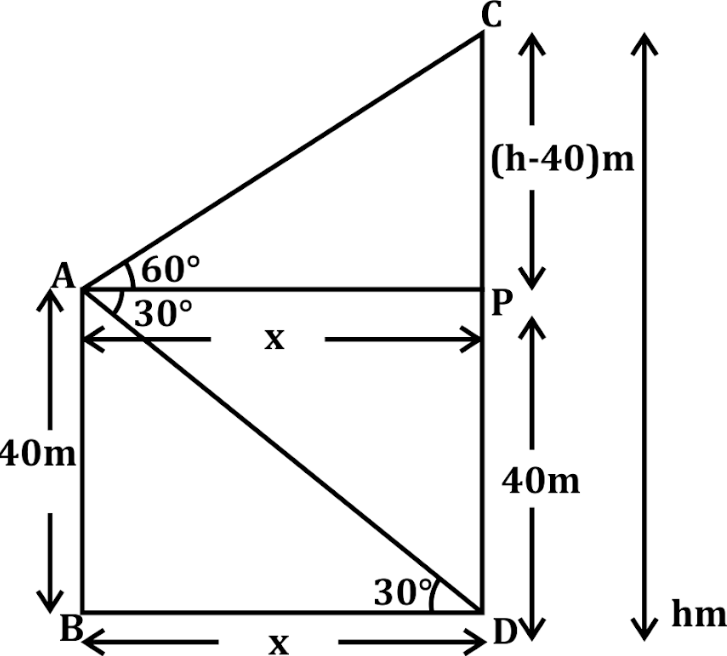 From the triangle formed with the top of the tower to the top of the chimney: tan(60°)=APPC3=xh−40.........(1)