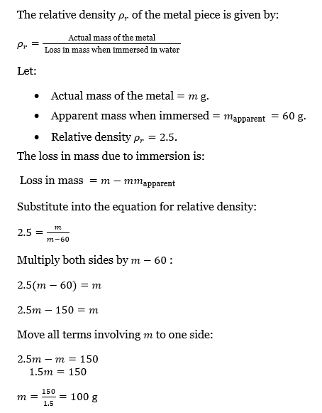 The apparent mass of a piece of metal when fully immersed in water is 60 gm. If the relative density of this metal piece is 2.5, find its actual mass (in gm)?