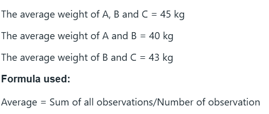 The average weight of A,B and C is 45 kg . If the average weight of A and B be 40 kg and that of B and C be 43 kg , then the weight of B is :