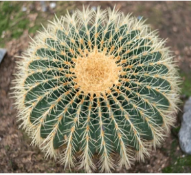 Echinocactus grusonii is popularly known by this name. It has prominent ribs and sharp spines.