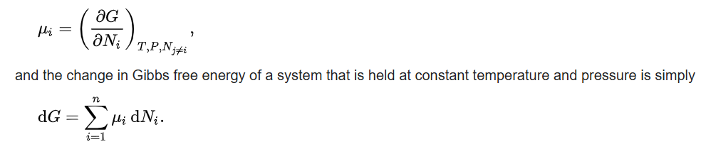 The chemical potential of a species is the energy that can be absorbed or released due to a change of the particle number of the given species, e.g. in a chemical reaction or phase transition. The chemical potential of a species in a mixture is defined as the rate of change of free energy of a thermodynamic system with respect to the change in the number of atoms or molecules of the species that are added to the system. Thus, it is the partial derivative of the free energy with respect to the amount of the species, all other species' concentrations in the mixture remaining constant. When both temperature and pressure are held constant, and the number of particles is expressed in moles, the chemical potential is the partial molar Gibbs free energy.