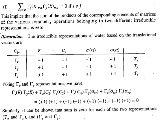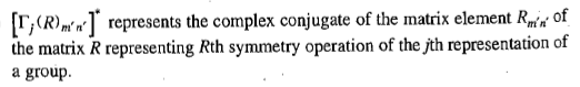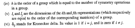 The elements of the matrices which constitute the irreducible representations of a group follow ‘the great orthogonality theorem’ which is stated as follows: