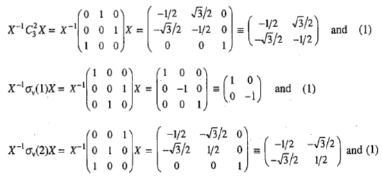 We find that the matrix A (which involves zeros along the diagonal and at the other places distributed unsymmetrically about the diagonal) is transformed into the matrix S (which involves zeros distributed symmetrically about the diagonal). Moreover, the nonzero elements in the matrix S are distributed along the diagonal into two blocks of the order 2×2 and 1× 1, respectively. If now the above similarity transformation involving the same matrices X and X-1 is extended to the corresponding matrices of the remaining symmetry operations of the point group C3v, we get