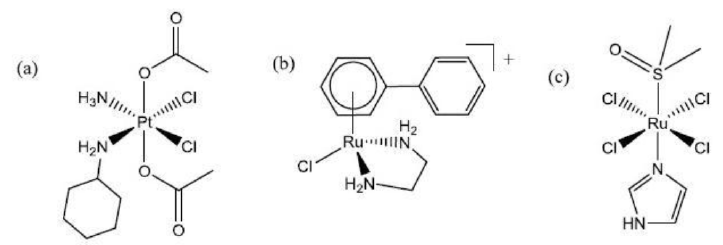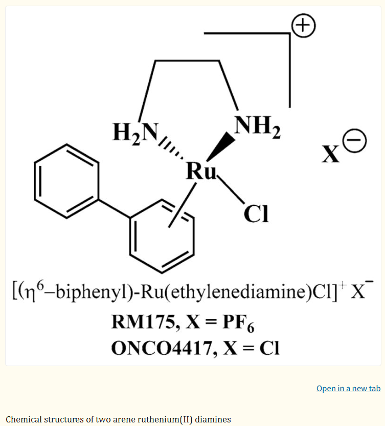 In 2001, a novel group of arene ruthenium(II) diamines was developed. These agents demonstrated strong cytotoxicity in cancer cells in vitro associated with a parallel DNA interaction. RM175, one of the lead compounds in this class. Substituting the hexafluorophosphate (PF6) anion in RM175 for chloride results in another ruthenium salt, ONCO4417, possessing antineoplastic activities. In vitro studies have demonstrated that ONCO4417 has comparable efficacy to platinum in a number of tumor cell lines (including ovarian, lung, esophageal, pancreatic, melanoma, and colorectal).