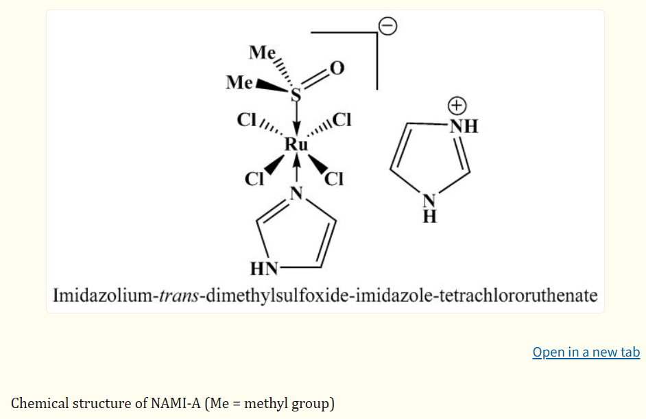 In preclinical studies, NAMI-A has demonstrated inhibitory effects against the formation of cancer metastases in a variety of tumor animal models but appears to lack direct cytotoxic effects. NAMI-A is capable not only of preventing the formation of metastases but also of inhibiting their growth once established. Preclinical animal studies using NAMI-A have shown selective activity against lung metastases from a variety of primary tumors in murine models. NAMI-A reduced the weight of lung metastases more than their number. Since larger concentrations of NAMI-A in the lungs than in other tissues was ruled out, this finding was assumed to be related to the selective interference of NAMI-A with the growth of metastases already established in the lungs.