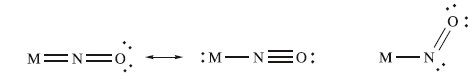 The NO molecule can bind to a low oxidation state metal atom, and once coordinated NO is known as a nitrosyl ligand. Terminally bound NO can adopt two different bonding modes: linear or bent. In the linear mode, NO donates three electrons to the metal centre. Experimentally, a ‘linear’ MNO unit may have M–N–O bond angles in the range 165–180°, and in the IR spectrum, the vibrational wavenumber for the νNO mode lies in the approximate range 1650–1900 cm-1. In the bent mode, NO donates one electron to the metal centre. Bent nitrosyl ligands are characterized by having M–N–O bond angles in the range 120–140°, and in the IR spectrum, the νNO absorption typically lies between 1525 and 1690cm-1 .
