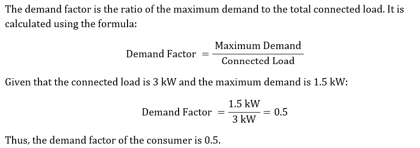 The connected load of a consumer is 3 kW and his maximum demand is 1.5 kW. The demand factor of the consumer is-