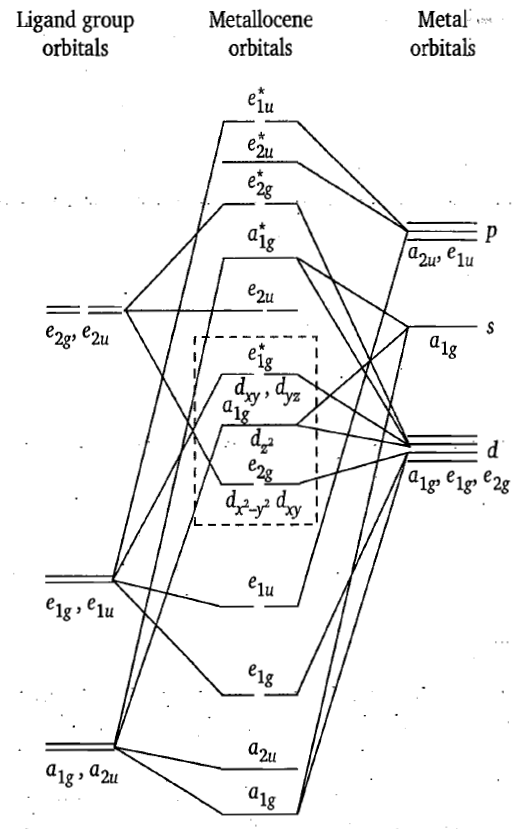 The molecular orbital energy diagram supported by photoelectron spectroscopy studies in conjunction with ligand field theory for ferrocene in figure.