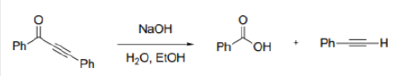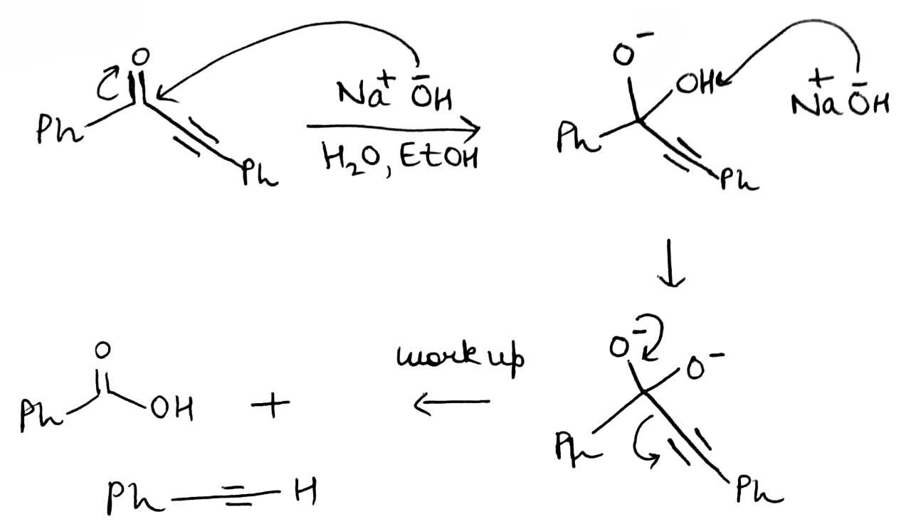 In the given reaction, OH- cannot act as a base due to the absence of an acidic hydrogen in the substrate. Therefore, it acts as a nucleophile and attacks the carbonyl carbon. The second step involves the abstraction of an acidic hydrogen by the OH- ion. The leaving group contains a sp hybridised carbon bearing a negative charge. The sp hybridised carbon having a negative charge is stable to due to its high electronegativity.