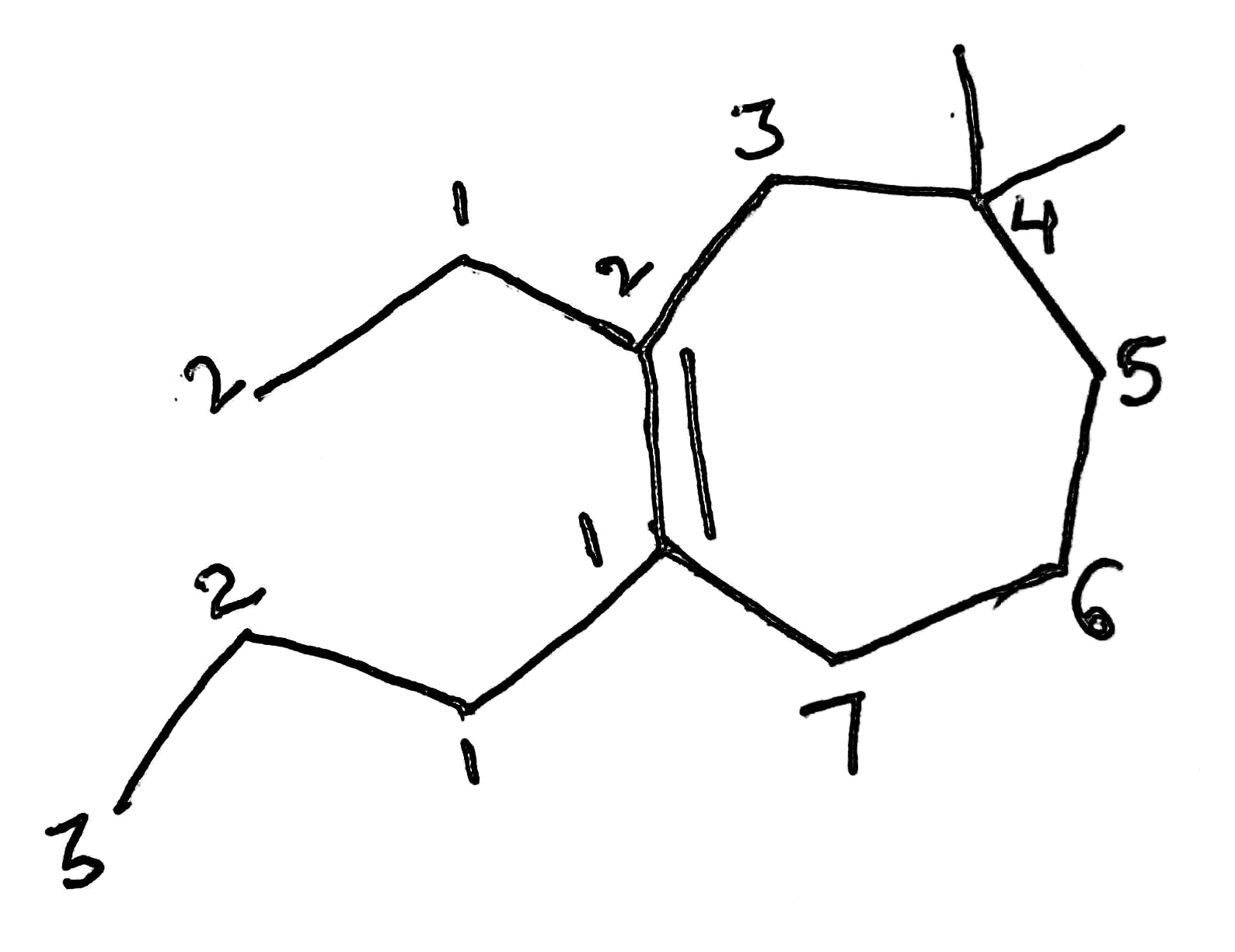 Numbering of the various substituents and bonds with their locants. If there is more than one of the same type of substituent/double bond, a prefix is added showing how many there are (di-2, tri-3, tetra-4, then as for the number of carbons below with 'a' added at the end). The numbers for that type of side chain will be grouped in ascending order and written before the name of the side-chain. If there are two side-chains with the same alpha carbon, the number will be written twice. Example: 2,2,3-trimethyl- . If there are both double bonds and triple bonds, "en" (double bond) is written before "yne" (triple bond).