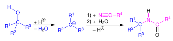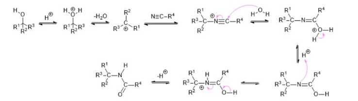 The Ritter reaction proceeds by the electrophilic addition of either a carbenium ion or covalent species to the nitrile. The resulting nitrilium ion is hydrolyzed to the desired amide.