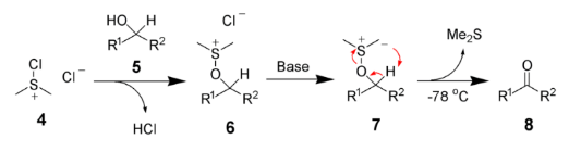 After addition of the alcohol 5, the chloro(dimethyl)sulfonium chloride 4 reacts with the alcohol to give the key alkoxysulfonium ion intermediate, 6. The addition of at least 2 equivalents of base -typically triethylamine- will deprotonate the alkoxysulfonium ion to give the sulfur ylide 7. In a five-membered ring transition state, the sulfur ylide 7 decomposes to give dimethyl sulfide and the desired carbonyl compound 8.
