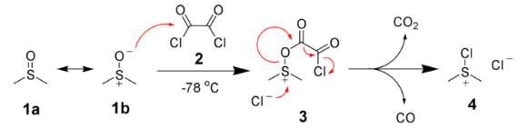 The first step of the Swern oxidation is the low-temperature reaction of DMSO, 1a, formally as resonance contributor 1b, with oxalyl chloride, 2. The first intermediate, 3, quickly decomposes giving off carbon dioxide and carbon monoxide and producing chloro(dimethyl)sulfonium chloride, 4.