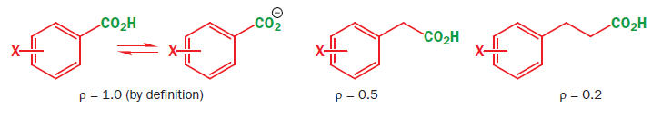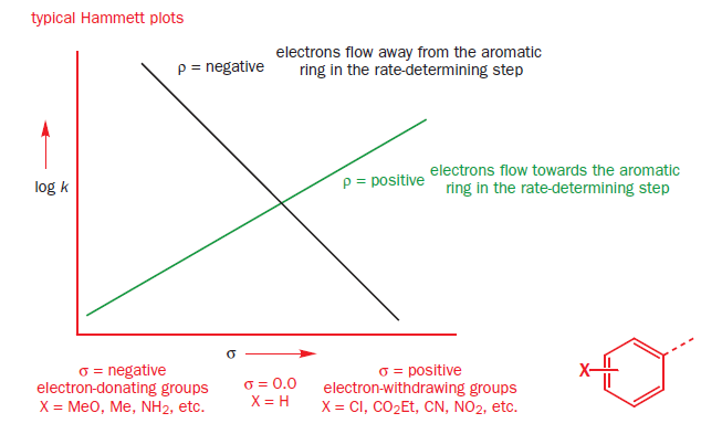 The Hammett reaction constant ρ measures the sensitivity of the reaction to electronic effects. A positive ρ value means more electrons in the transition state than in the starting material. A negative ρ value means fewer electrons in the transition state than in the starting material.