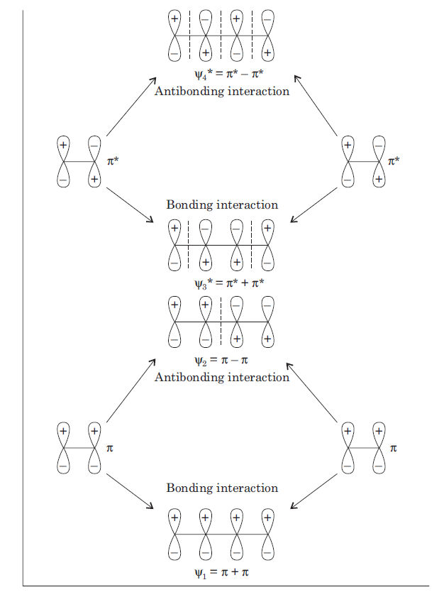 In 1, 3-butadiene, we have a system of four p orbitals on four adjacent carbons. These four p orbitals will overlap to produce four π molecular orbitals. We can get four new MOs in a number of equivalent ways. One of the ways to obtain four new molecular orbitals is by linear combination of two molecular orbitals of ethylene. Linear combination of orbitals is also known as perturbation theory or perturbation molecular orbital (PMO) theory. Linear combination always takes place between two orbitals (two atomic orbitals, two molecular orbitals or one atomic and one molecular orbitals) having minimum energy difference. This means that we need to look only at the results of the π ± π and π* ± π* interactions and do not have to consider π ± π*.