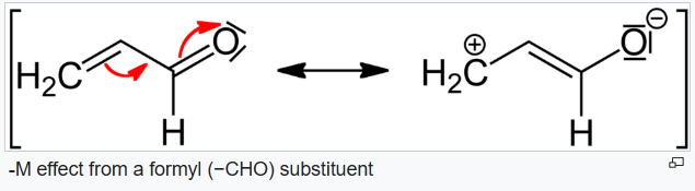 The -M effect, also known as the negative mesomeric effect, occurs when the substituent is an electron-withdrawing group. In order for a negative mesomeric (-M) effect to occur the group must have a positive charge or an empty orbital in order to draw the electrons towards it. In the -M effect, the pi electrons move away from the conjugate system and towards the electron drawing group. In the conjugate system, the density of electrons decreases and the overall charge becomes more positive. With the -M effect the groups and compounds become less reactive towards electrophiles, and more reactive toward nucleophiles, which can give up electrons and balance out the positive charge.