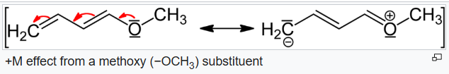 The +M effect, also known as the positive mesomeric effect, occurs when the substituent is an electron donating group. The group must have one of two things: a lone pair of electrons, or a negative charge. In the +M effect, the pi electrons are transferred from the group towards the conjugate system, increasing the density of the system. Due to the increase in electron density, the conjugate system will develop a more negative charge. As a result, the system under the +M effect will be more reactive towards electrophiles, which can take away the negative charge, than a nucleophile.