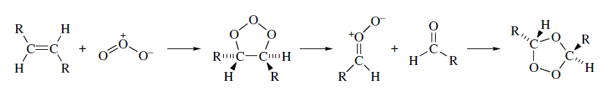 The reaction of alkenes with ozone constitutes an important method of cleaving carbon-carbon double bonds. Application of low-temperature spectroscopic techniques has provided information about the rather unstable species that are intermediates in the ozonolysis process. These studies, along with isotope labeling results, have provided an understanding of the reaction mechanism. The two key intermediates in ozonolysis are the 1,2,3-trioxolane, or initial ozonide, and the 1,2,4-trioxolane, or ozonide. The first step of the reaction is a cycloaddition to give the 1,2,3-trioxolane. This is followed by a fragmentation and recombination to give the isomeric 1,2,4-trioxolane. The first step is a 1,3-dipolar cycloaddition reaction. Ozone is expected to be a very electrophilic 1,3-dipole because of the accumulation of electronegative oxygen atoms in the ozone molecule. The cycloaddition, fragmentation, and recombination are all predicted to be exothermic on the basis of thermochemical considerations.