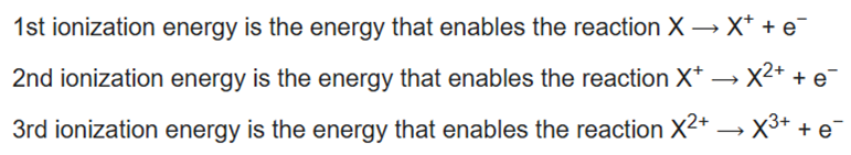 The nth ionization energy refers to the amount of energy required to remove the most loosely bound electron from the species having a positive charge of (n − 1). For example, the first three ionization energies are defined as follows: