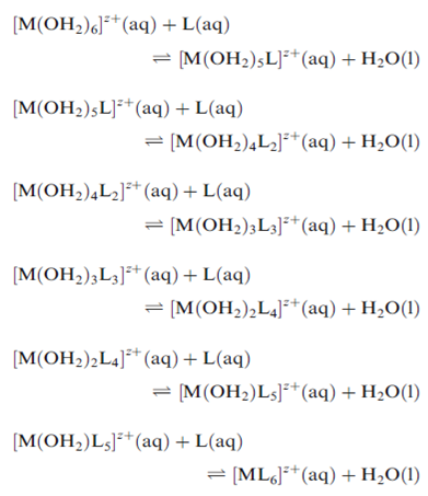 Metal ions in aqueous solution are hydrated. The aqua species may be denoted as Mz+ (aq) where this often represents the hexaaqua ion [M(OH2)6]z+ . Now consider the addition of a neutral ligand L to the solution, and the formation of a series of complexes.