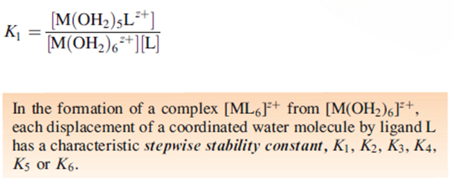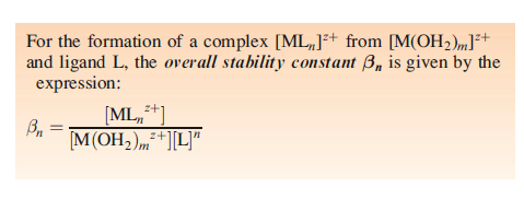 Alternatively, we may consider the overall formation of [ML6]z+. In order to distinguish stepwise and overall stability constants, the symbol β is generally used for the latter.