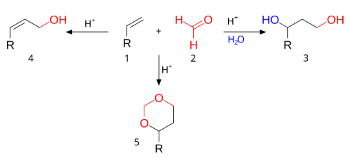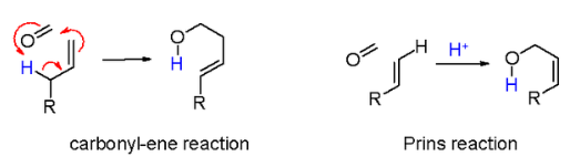 The reaction mechanism for this reaction is depicted in scheme 5. The carbonyl reactant (2) is protonated by a protic acid and for the resulting oxonium ion 3 two resonance structures can be drawn. This electrophile engages in an electrophilic addition with the alkene to the carbocationic intermediate 4. Exactly how much positive charge is present on the secondary carbon atom in this intermediate should be determined for each reaction set. Evidence exists for neighbouring group participation of the hydroxyl oxygen or its neighboring carbon atom. When the overall reaction has a high degree of concertedness, the charge built-up will be modest.