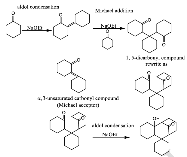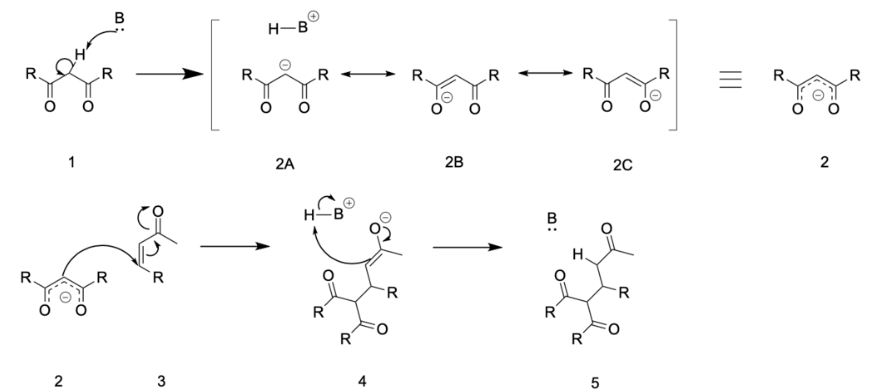 Deprotonation of 1 by a base leads to carbanion 2, stabilized by its electron-withdrawing groups. Structures 2a to 2c are three resonance structures that can be drawn for this species, two of which have enolate ions. This nucleophile reacts with the electrophilic alkene 3 to form 4 in a conjugate addition reaction. Finally, enolate 4 abstracts a proton from protonated base (or solvent) to produce 5.