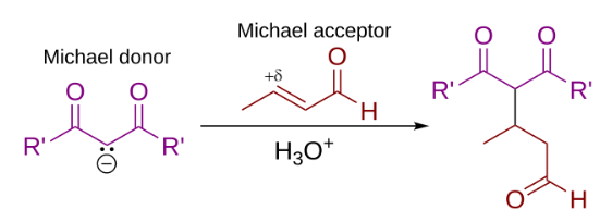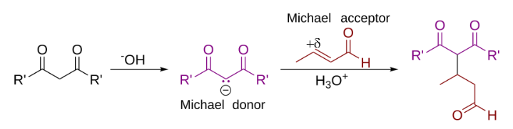 In this general Michael addition scheme, either or both of R and R' on the nucleophile (the Michael donor) represent electron-withdrawing substituents such as acyl, cyano, nitro, or sulfone groups, which make the adjacent methylene hydrogen acidic enough to form a carbanion when reacted with the base, B:. For the alkene (the Michael acceptor), the R" substituent is usually a carbonyl, which makes the compound an α,β-unsaturated carbonyl compound (either an enone or an enal), or R" may be any electron withdrawing group.