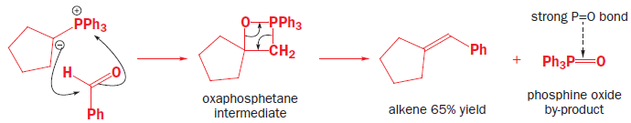 Ylids can be isolated, but are usually used in reactions immediately they are formed. They are nucleophilic species that will attack the carbonyl groups of aldehydes or ketones, generating the four-membered ring oxaphosphetane intermediates. Oxaphosphetanes are unstable: they undergo elimination to give an alkene (65% yield for this particular example) with a phosphine oxide as a byproduct. The phosphorus–oxygen double bond is extremely strong and it is this that drives the whole reaction forward.